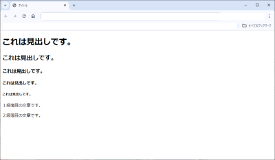 <body> <div> <h1>これは見出しです。</h1> <h2>これは見出しです。</h2> <h3>これは見出しです。</h3> <h4>これは見出しです。</h4> <h5>これは見出しです。</h5> </div> <div> <p><span>1<span>段落目の文章です。</p> <p><span>2</span>段落目の文章です。</p> </div> </body>