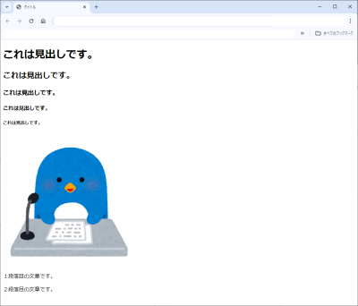 <body> <div> <h1>これは見出しです。</h1> <h2>これは見出しです。</h2> <h3>これは見出しです。</h3> <h4>これは見出しです。</h4> <h5>これは見出しです。</h5> </div> <div> <img src="./animal_chara_radio_penguin.png"> </div> <div> <p><span>1<span>段落目の文章です。</p> <p><span>2</span>段落目の文章です。</p> </div> </body>