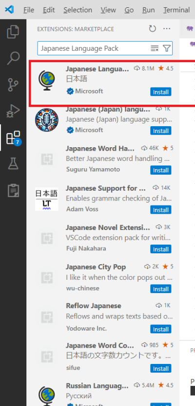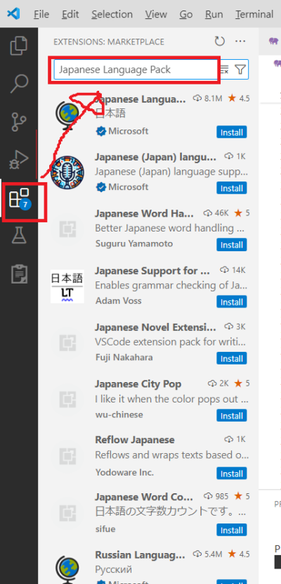拡張機能をクリックし、検索窓に「Japanese Language Pack」を入力する。