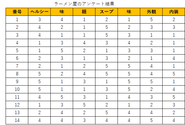 このデータから、見出しごとの合計という情報を取得する場合にはどうするか、を考えます。例えば「ヘルシー」という列の合計は○○点、「味」という列の合計点は○○点、などというように、合計点を出すということです。