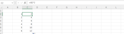 いま下の図のようなデータがあり、C列に、それぞれの値を2倍した値を出力したいとします。
